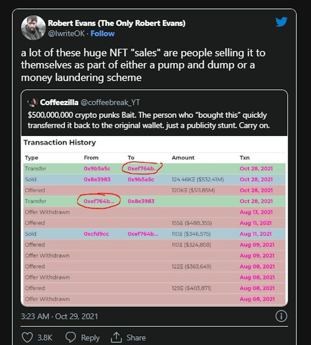 "Pump and dump" is not a new thing in the crypto space. This is a situation whereby a group of people buy a lot of NFT and hype it up to make it seem very popular to people. Once they have gotten people's attention, and those people start to buy the NFT, these groups now sell, leaving those that came late to bear the losses. Review the transactions made on an NFT before you try to buy to spot a pump and dump scheme.